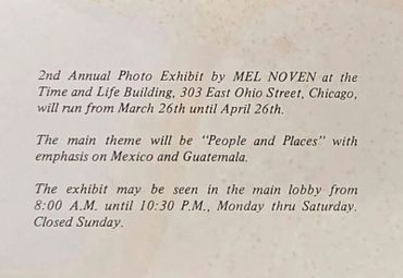 Mel Noven displayed his photography throughout the Chicago area. These locations included the Time-Life Building, Thorek Hospital, CBS Radio, Barth Galleries, Chicago Press and other locations.